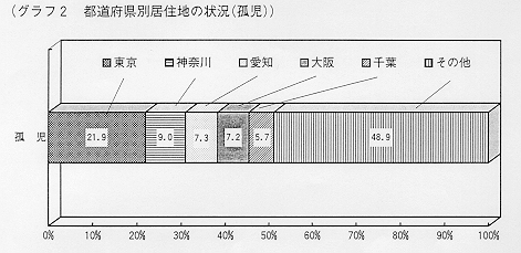 都道府県の居住地の状況をみると,孤児では東京都が全体の21.9%と最も多く,次いで神奈川県9.0%,愛知県7.3%となっている。 《グラフ2 都道府県別居住地の状況(孤児)》 婦人等の都道府県別の居住地の状況をみると,孤児同様に東京都が最も多くなっているが,長野県が3番目に多くなっており,孤児に比して長野県に比較的多くの婦人等が定着している状況がみられる。 《グラフ3 都道府県別居住地の状況(婦人等,合計)》