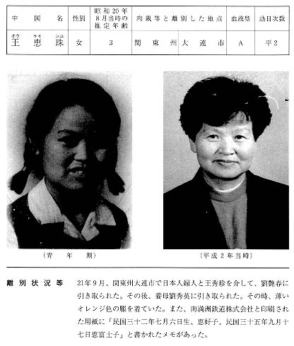 | 離別状況等 | 21年9月、関東州大連市で日本人婦人と王秀珍を介して、劉艶春に引き取られた。その後、養母劉秀英に引き取られた。その時、薄いオレンジ色の服を着ていた。また南満州鉄道株式会社と印刷された用紙に「民国三十二年七月六日生、恵好子、民国三十五年九月十七日恵富士子」と書かれたメモがあった。 |