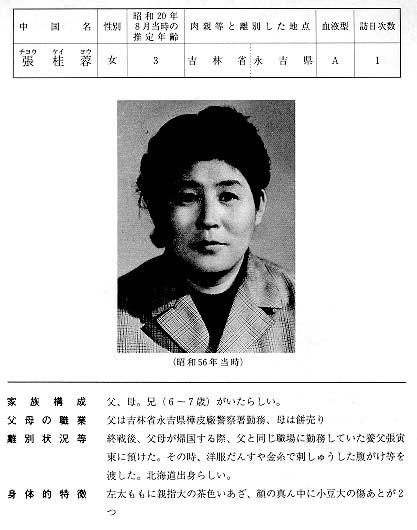 | 中国名 | 読み仮名 | 性別 | 終戦時推定年齢 | 離別地点 | 血液型 | 年度 | |