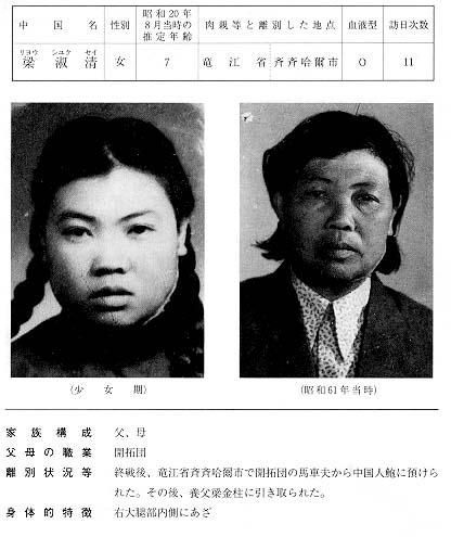 終戦後、竜江省斉斉哈爾市で開拓団の馬車夫から中国人鮑に預けられた。その後、養父梁金柱に引き取られた。