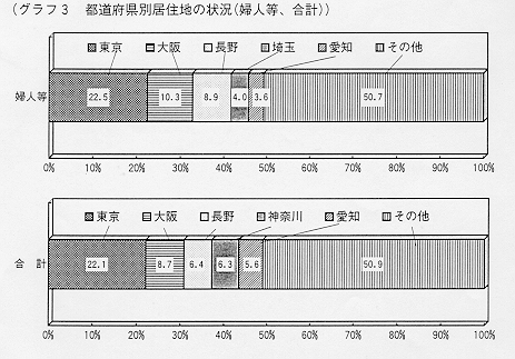 都道府県の居住地の状況をみると,孤児では東京都が全体の21.9%と最も多く,次いで神奈川県9.0%,愛知県7.3%となっている。 《グラフ2 都道府県別居住地の状況(孤児)》 婦人等の都道府県別の居住地の状況をみると,孤児同様に東京都が最も多くなっているが,長野県が3番目に多くなっており,孤児に比して長野県に比較的多くの婦人等が定着している状況がみられる。 《グラフ3 都道府県別居住地の状況(婦人等,合計)》