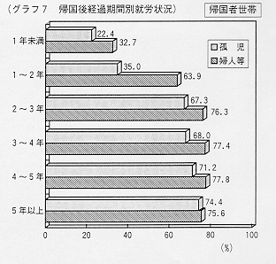 世帯で就労状況を帰国後経過期間別にみると,帰国後年数を経る毎にその割合は増加している。