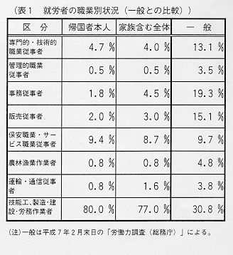 就労している者の職業は多岐にわたっているが,帰国者本人,家族全体のいずれも「技能工,製造・建設・労務作業者」が多くなっている。