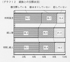 親族と交際しているのは,身元判明孤児では54.5%,婦人等では48.2%となっている。 あまり交際していない世帯は,「親族が近くにいないから」等を理由としてあげている。 《グラフ12 親族との交際状況》