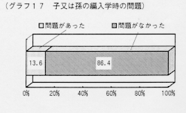 帰国者の子の年齢では,16歳以上の者が全体の94.5%を占めており,学齢児に相当する6歳から15歳の者の割合は5.5%となっている。 又,孫の年齢では,16歳以上の者が全体の32.9%を占めており,学齢児に相当する6歳から15歳の者の割合は67.1%となっている。 《グラフ16 子(孫)の年齢(学齢児の場合)》 帰国者の子又は孫が小学校,中学校又は高等学校に編入する際「問題がなかった」と答えた者が86.4%となっている。 《グラフ17 子又は孫の編入学時の問題》