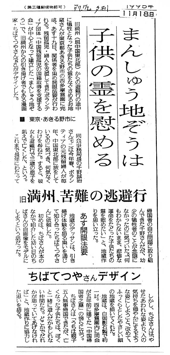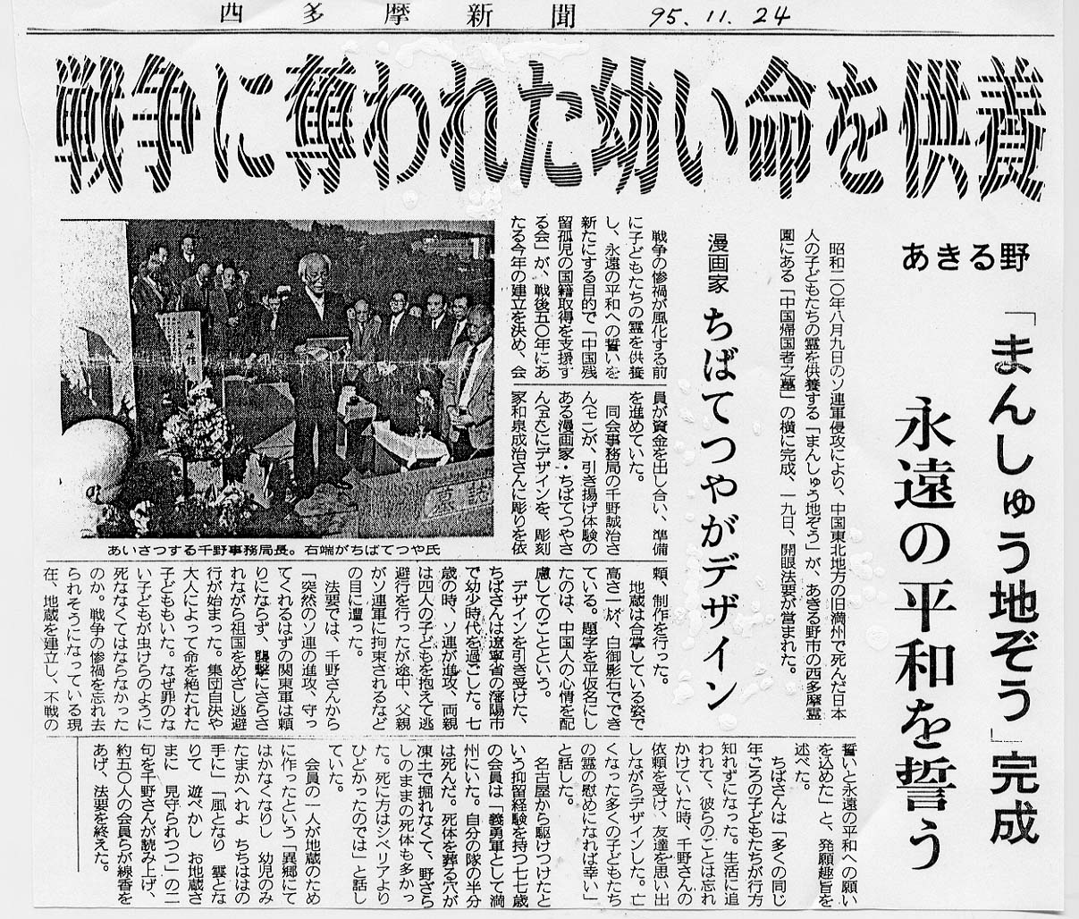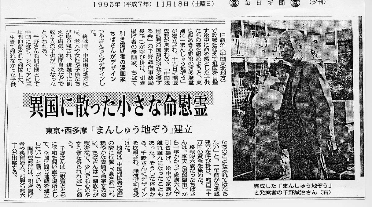 あれから五十年の歳月が過ぎ去りました。ともすれば戦争の惨禍が忘れられ、多くの子供たちの貴い命がその犠牲になったことも消えてしまいそうです。改めてここに、幼い御霊よ安らかなれと祈り、再びあやまちを繰り返さないことを誓い、永遠の平和の願いをこめて『まんしゅう地ぞう』を建立した次第です。お地蔵さまのお慈悲、皆の思いは遠く満洲の地に眠る非運の子供たちに届くことを信じてやみません。